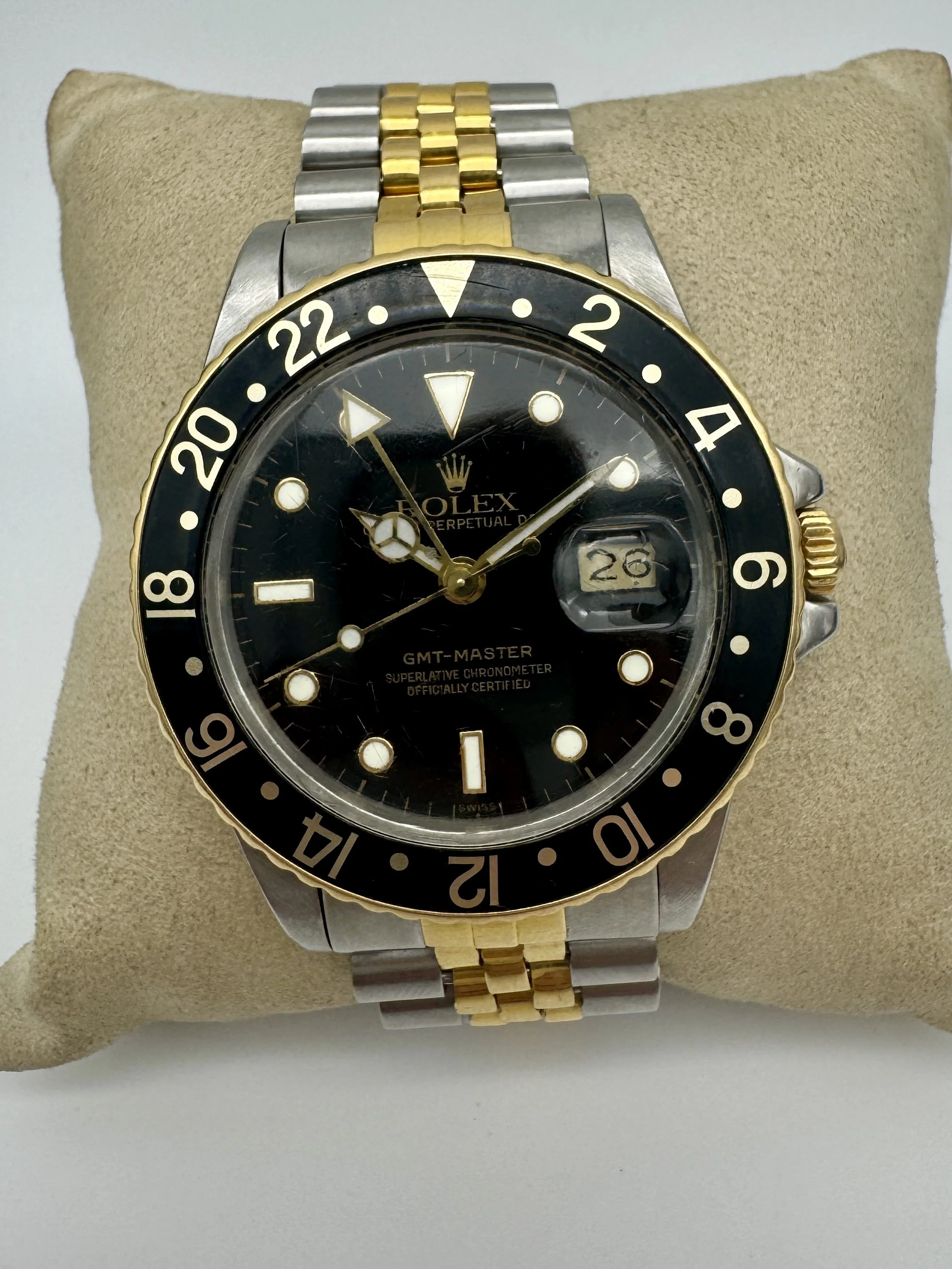 Rolex GMT-Master Ref. 16753 Year 1986 8.9 million serial. The watch has been serviced by Rolex and the dial and hands have been replaced by them. The Rolex is running excellent. It comes with its original bracelet. It is in honest condition. On customer request polish is possible. If you have any further questions, feel free to reach out.